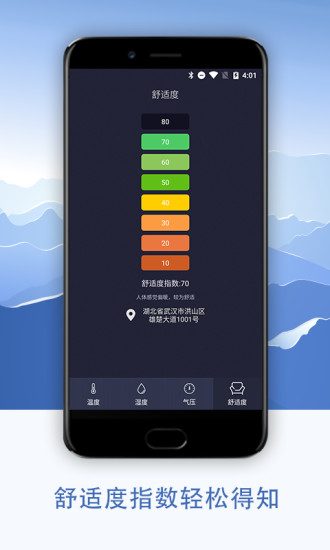 根據(jù)當(dāng)前的氣壓值,測量出當(dāng)前環(huán)境對人體的舒適度。同時支持攝氏溫度計和華氏溫度計。
